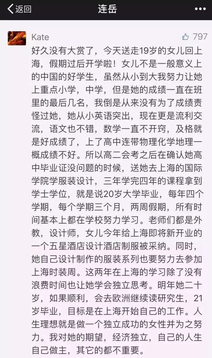 结果证明,女孩儿走对了,她拥有了自己擅长且喜欢的事业,成功与幸福几近兼得,父母可以放心了。